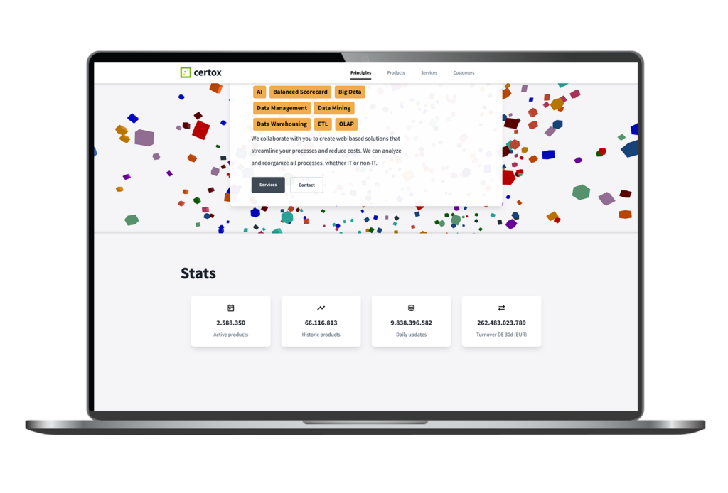 certox bietet umfassende IT-Consulting-Leistungen und berät zu Software-, Daten- und Systemkonzepten im Finanzumfeld. Darüber hinaus entwickelt es individuelle Softwarelösungen für Finanz- und Datenanwendungen sowie eigene und partnerbasierte IT-Tools. Ergänzt wird das Angebot durch Finanzinformationsdienste mit Daten und Analysewerkzeugen zu Zertifikaten und strukturierten Produkten sowie durch Schulungen in Form von Workshops und Trainings rund um Finanzdaten und deren Anwendung. ARIVA arbeitet mit certox bereits seit 2007 zusammen.